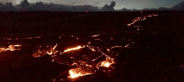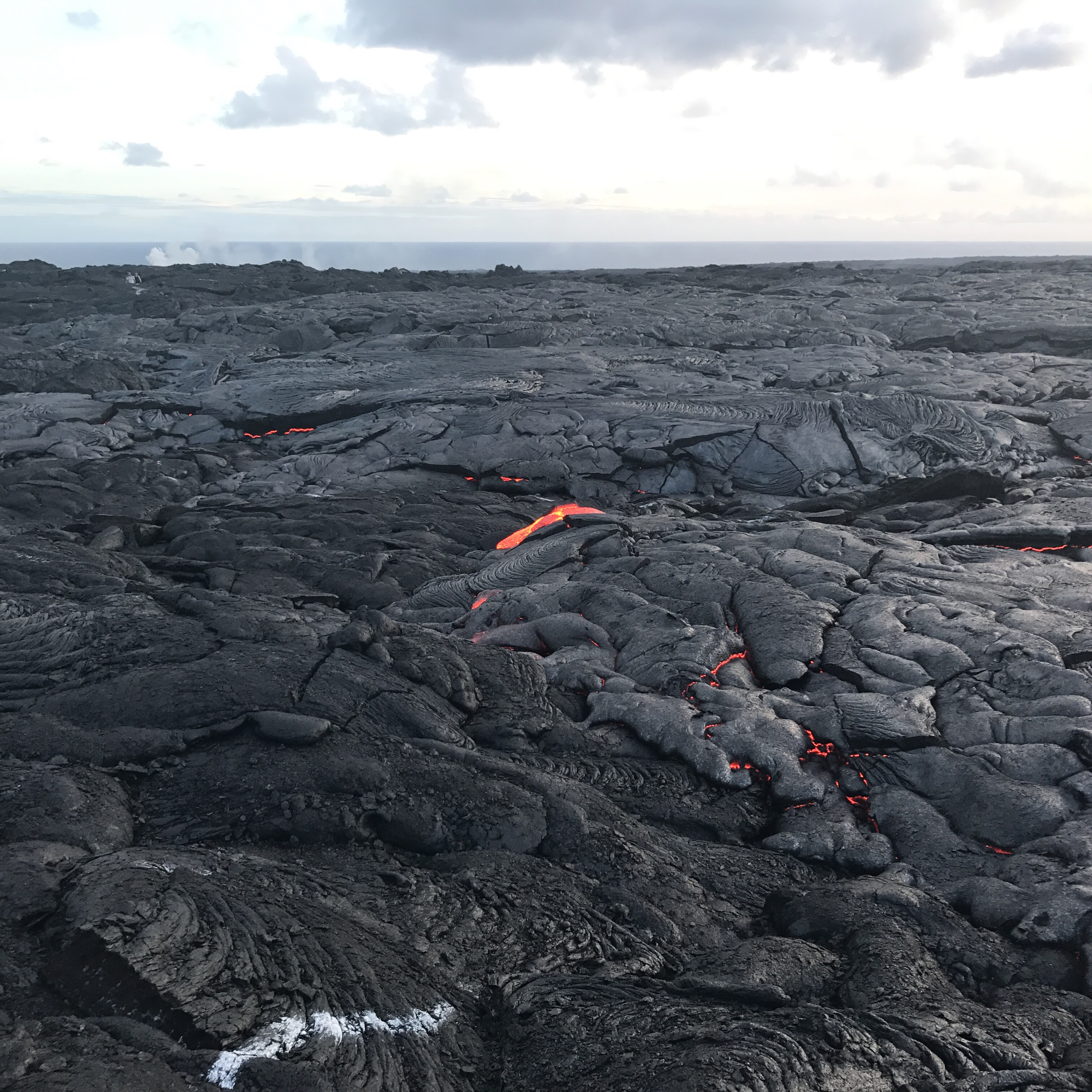 Auf Big Island schlummern die meisten Vulkane (könnten also theoretisch jederzeit ausbrechen), ausser der Kilauea im Süd-Osten von Big Island, der ist nämlich aktiv. Das Besondere dabei ist, dass die Lava des Kilauea einen Fluss bildet, der langsam ins Meer hinein fliesst. Da es keine Eruptionen gibt, kann man relativ sicher ganz nah an die Lava heran – somit ist dies wahrscheinlich der einzigste Ort auf der Welt, wo man theoretisch seine Bratwurst über Lava grillen könnte 😂. Wir hatten zwar keine Würstchen parat, hatten aber trotzdem ein Picknick mit leckerem Grilled Chicken und Kalua Pork geholt, welches wir mit auf den Vulkan nehmen wollten.