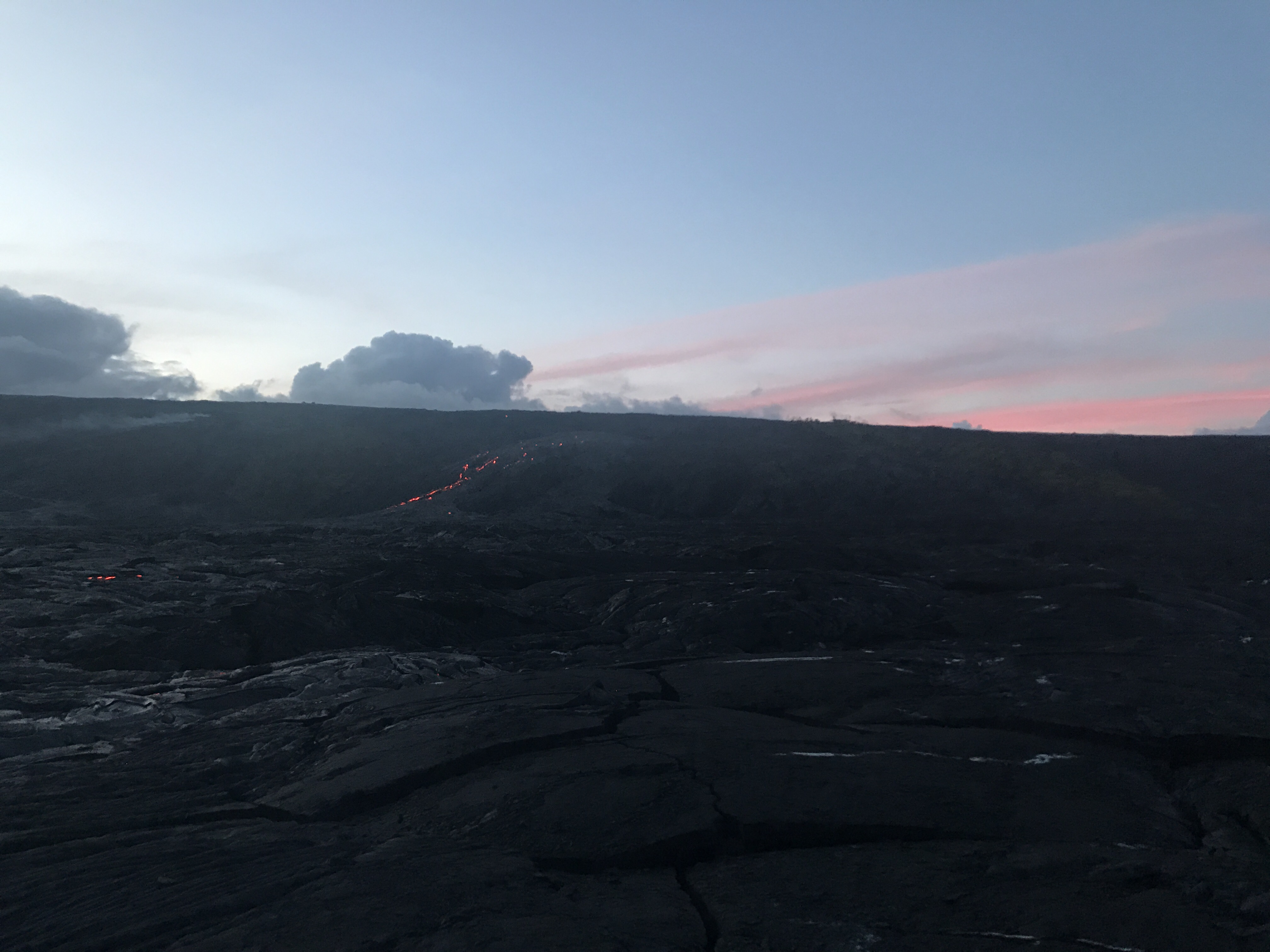 Es war eine nette Wanderung über das knisternd-glitzernde Lavafeld. Die glühende Sonne hatte sich zum Glück hinter einem Wölkchen versteckt und es war auch nur noch eine halbe Stunde bis Sonnenuntergang. Auf einmal wurde es plötzlich ziemlich warm und wir stellten fest, dass der Boden unter uns heiss war. Wenige Meter entfernt sahen wir dann die erste Lava, lebende Erde, die sich ihren Weg an die Oberfläche sucht.