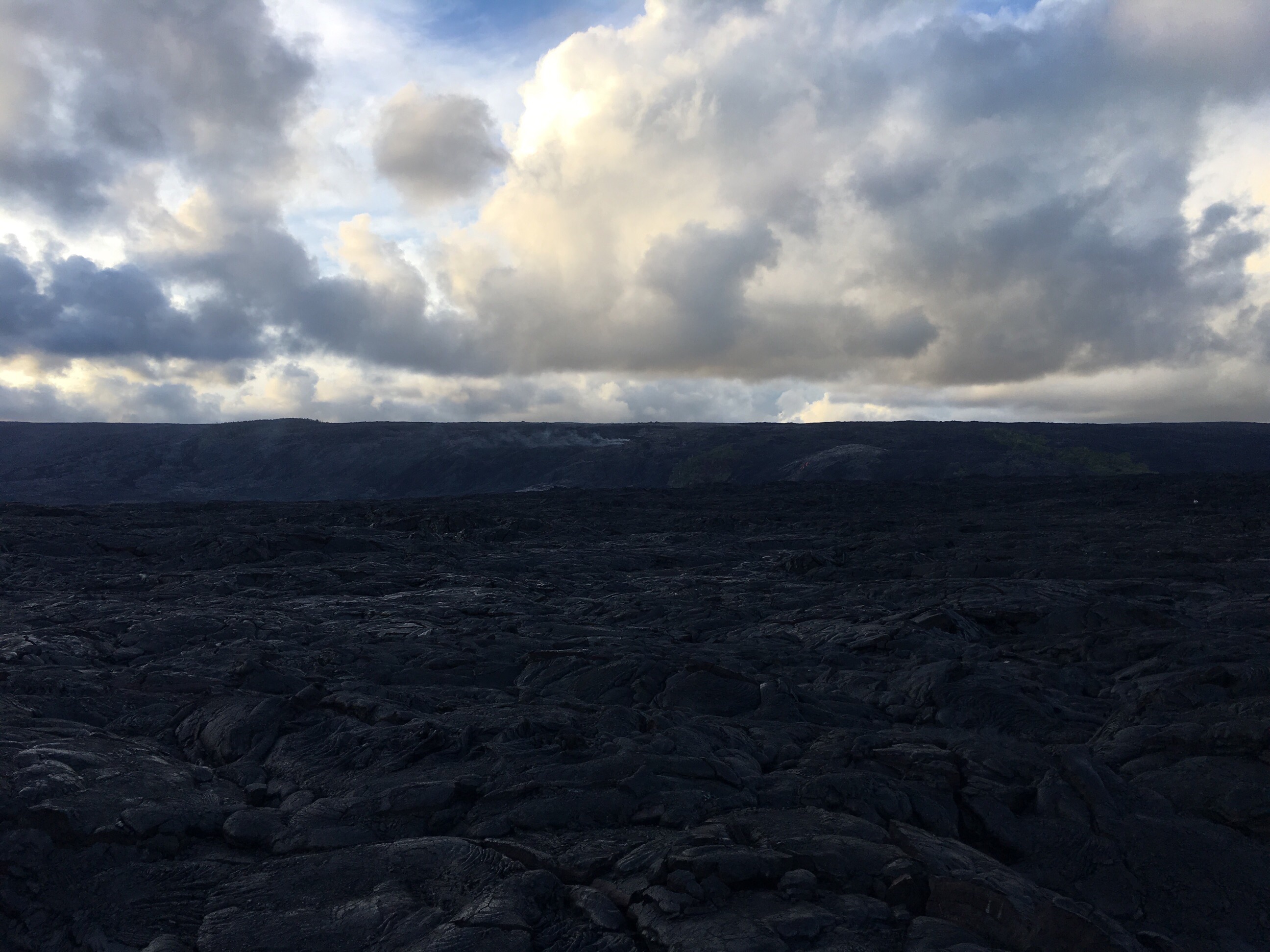 Wir sind also mit dem Auto bis nach Kalapana gefahren, haben uns Räder gemietet und sind damit 4 Meilen bis zur Lava Viewing Area gefahren. Von dort musste man die Räder dann stehen lassen und zu Fuss weiter wandern, da wir in ein Gebiet kamen, welches sich durch den Lavafluss täglich ändert, so dass es keine Wege gibt. Die Ranger deuteten uns in eine Richtung querfeldein, wo wir nach circa einer Stunde / 3 Meilen zum Lavafluss kommen sollten. Da es noch Nachmittag und somit hell war, war bis auf grau-braune erkühlte Lavamasse nicht viel zu erkennen. Aber gut: das Abenteuer konnte beginnen!